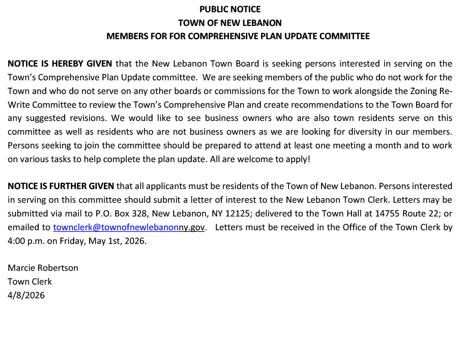 Read the Town’s Publications to get a taste of what is going on. Visit New Lebanon’s Facebook page or the New Lebanon Climate Smart Communities Facebook page.